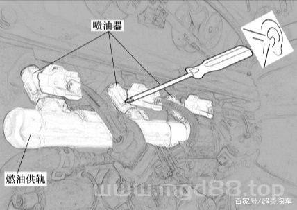3. 若点火系统正常,可在发动机工作时,用听诊工具抵在喷油器体上(如下图所示),检查喷油器有无“嗒嗒”的工作振动,如未听到工作声音,可本着由简到繁的原则检查喷油器电阻、插接器、线路及ECU,若能听到工作声,不代表喷油器工作完全正常,因为喷油器仍可能存在堵塞、滴漏、雾化不良、喷油量异常等机械故障,从而导致发动机出现失火,怀疑此故障可利用喷油器清洗机对喷油器进行清洗,检查,如清洗后效果仍不明显,应更换喷油器。另外,在拆检喷油器前采用喷油器免拆清洗法,也是一种不错的尝试。